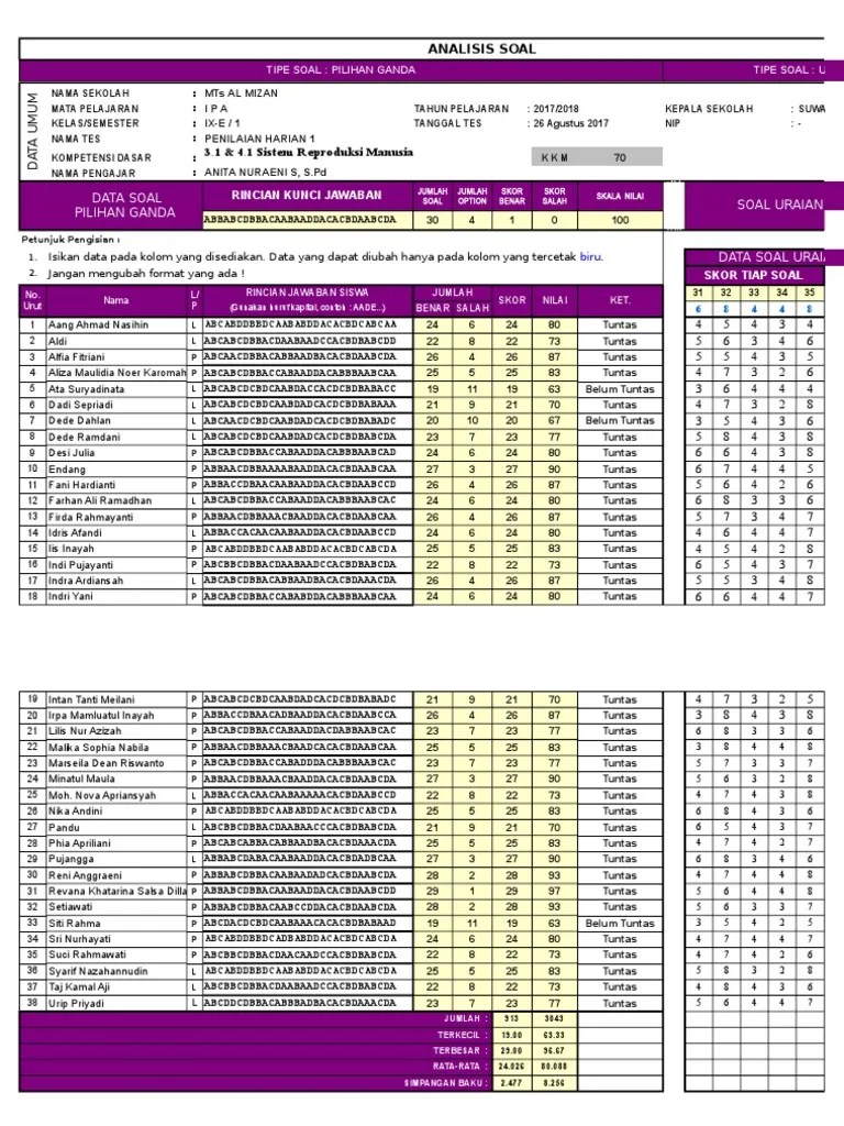 Aplikasi analisis butir soal pilihan ganda dan contoh pengisian ini untuk membantu guru mengidentifikasi kualitas soal. Tingkat kesukaran dan efektifitas pengecoh (khusus soal pilihan ganda). Analisis butir soal semester ganjil mata pelajaran matematika pada sekolah. Data umum mata pelajaran : Aplikasi analisis butir soal pilihan ganda format excel terbaru akan memberikan jawaban cara cepat untuk mengoreksi jawaban dari soal uas, uts atau ulangan .